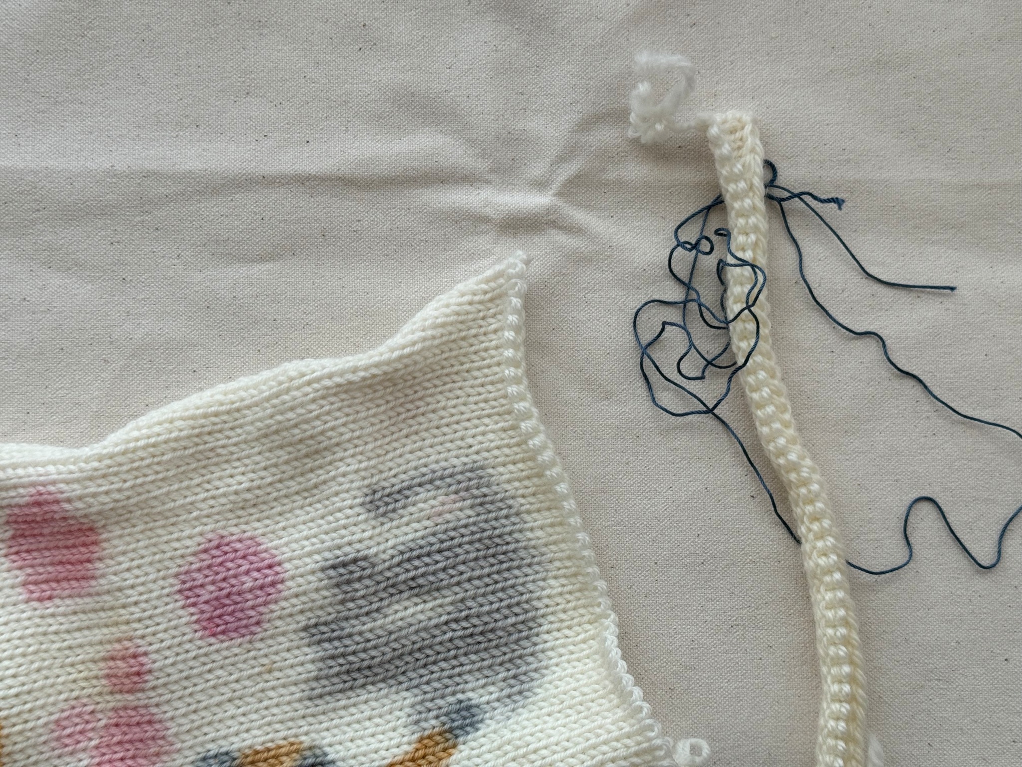 ソックヤーンの始まりと捨て編みの間にネイビーのコットンあとが編んであります。