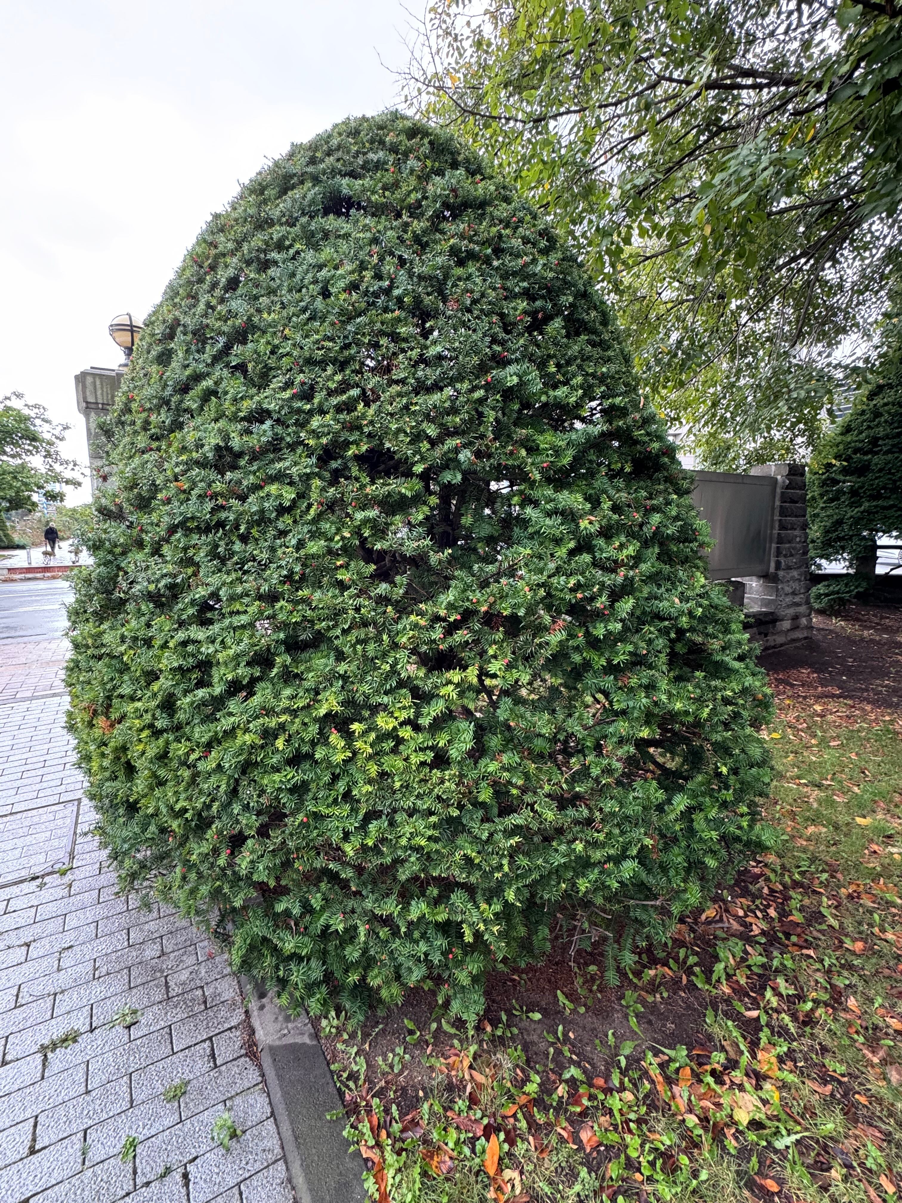 オンコの深い緑、周囲のやさしい土の色合い